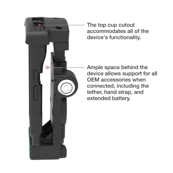 - Spring-loaded powered dock featuring GDS® Technology™ is designed to accommodate IntelliSkin®-wrapped handheld devices including the Zebra TC2x & TC5x series