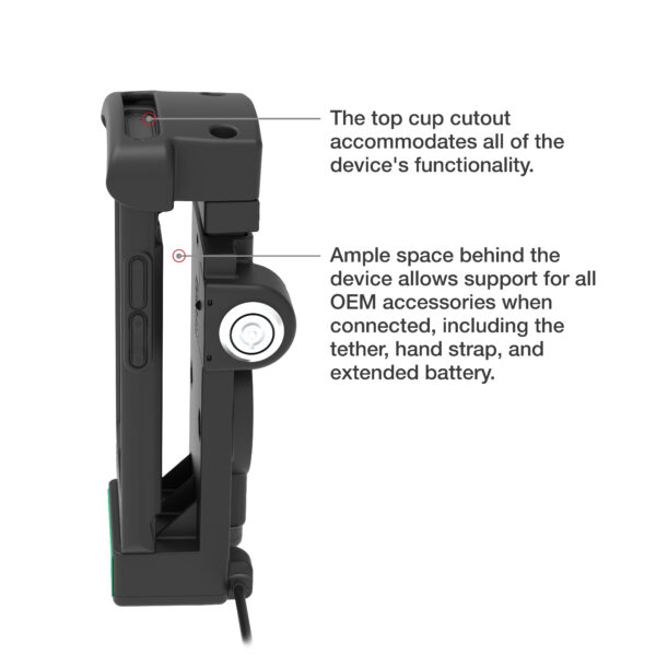- Spring-loaded powered dock featuring GDS® Technology™ is designed to accommodate IntelliSkin®-wrapped handheld devices including the Zebra EC5x series
