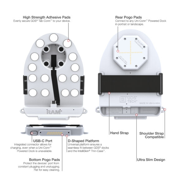 The GDS Tab-Conn for OtterBox Defender Cases (D Shape & Rear Pads) – Gray (RAM-GDS-TABC-OTD1DB-GRY) allows you to add the very best features from IntelliSkin to your tablet enclosed in an Otterbox Defender. By installing this adhesive adapter, you protect your device’s USB-C port with the integrated pogo pin connection and unlock the GDS Ecosystem of vehicle docks, desktop docks, mass charging solutions, ergonomic accessories, and more. The flat, ruggedized pogo pad contacts are made for repetitive docking to protect the device’s port and collect less dirt making them easier to clean. An integrated USB Type-C connector at the bottom of the case allows for device charging even when you don’t have a GDS Powered Uni-Conn Dock available. This low-profile adapter is a cost-efficient solution that allows users to integrate GDS Tech solutions into their business workflow without having to get rid of their current case and reduce the cost of an overall device refresh. The light gray aesthetic is ideal for sophisticated, bright workplaces in industries such as retail, medical, and more. GDS Tab-Conn with Rear Pogo Pads is only compatible with GDS Powered Uni-Conn docks, easily identified by the GDS Powered Uni-Conn Adapter emblem. One Dock to Connect Them All. Always Protected. Always Connected.