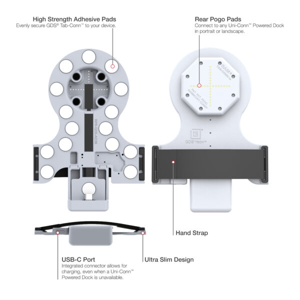 • Hard plastic, adhesive GDS® Uni-Conn™ adapter with rear pogo pads for bare tablets