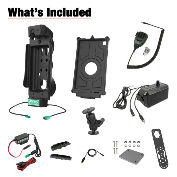 • Bundle includes the GDS® Tough-Dock™, IntelliSkin® Next Gen for Samsung Tab A7 Lite 8.7", GDS® Modular 10-30V Hardwire Charger, C Size double ball mount with short arm, backing plate adapter, bracket adapter, audio adapter cable (3.5mm to USB Type-A), GDS® Audio™ amplified speaker, RAM® microphone, and cable clamps
