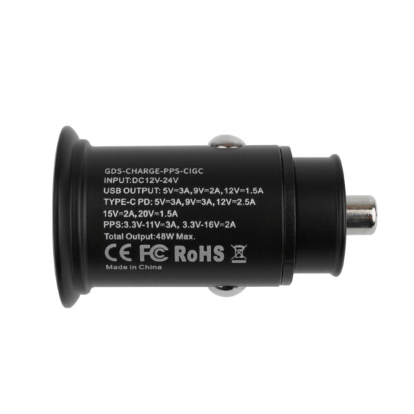 - Two-port GDS® USB Type-C and USB Type-A cigarette charger; total output of 48W max