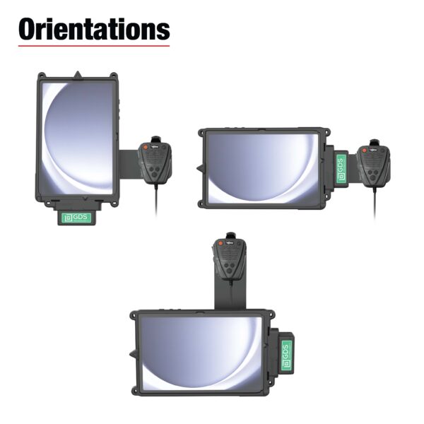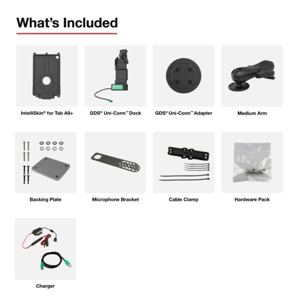 • Bundle includes GDS® Uni-Conn™ dock, Uni-Conn™ adapter, IntelliSkin® for the Samsung Tab A9+, a microphone bracket, hardwire charger, and a double ball mount with backing plate