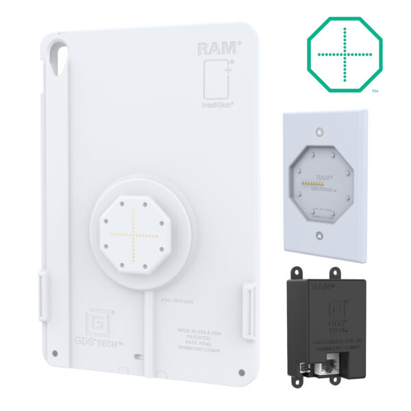 The GDS Uni-Conn Powered Low Profile Wall Dock with PoE – Gray (RAM-GDS-DOCK-W7-POEU-GRY) is a wall docking solution for devices enclosed in an IntelliSkin Thin-Case with Rear Pogo Pads. Power is provided to the pogo pins integrated into the GDS Uni-Conn adapter via the JST connector and PoE Adapter. This dock installs directly over a standard rectangular electrical outlet box. Easily dock and undock your device with the assistance of the magnetic attachment mechanism. The light gray aesthetic is ideal for sophisticated, bright workplaces in industries such as retail, medical, and more. One Dock to Connect Them All Always Protected. Always Connected.