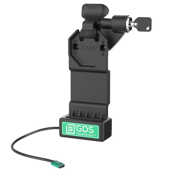The GDS Uni-Conn Right Locking Powered Dock (RAM-GDS-DOCKLR-U1CPU) is a revolutionary universal docking platform. This clip-in, quick-release solution securely holds your device in place and features a key lock on the right side for additional theft deterrence. For the same dock with a lock on the left side, see RAM-GDS-DOCKLL-U1CPU. When docked, power is delivered via the pogo pin connection, enabled by the USB-C female connector. It features an easy docking and undocking process, simply place the IntelliSkin-wrapped device into the base of the dock and push it to snap into place. When undocking, a simple push of a lever releases the tablet. The docking station requires the GDS Uni-Conn adapter (RAM-GDS-U1U) to be installed on the intended IntelliSkin-wrapped device. Current compatibility for this fixed dock height includes the Samsung Tab A7 Lite, Tab A 8.4, Tab S9 FE, Tab S9 FE+, Tab Active5, Tab Active3, and Tab A9+. The GDS Uni-conn dock is backed by a 3-year warranty. Warranty is void if lever stop is not installed. Always Protected. Always Connected. One Dock to Connect Them All.