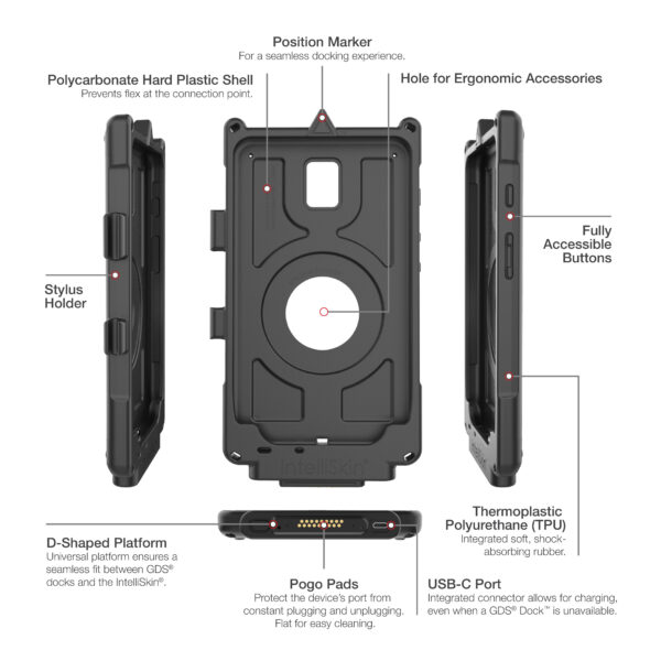 The IntelliSkin Next Generation protective sleeve for the Samsung Galaxy Tab Active2 includes all the great features of the original IntelliSkin while adding several enhancements. An insert molded redesign of the skin combines a hard plastic shell with soft, shock-absorbing rubber. Ruggedized contacts for repetitive docking in field applications remain on the exterior, but are now flat to collect less dirt and allow for easier cleaning. And an integrated USB Type-C connector at the bottom of the skin allows for device charging even when you dont have a GDS Dock available. Like the original IntelliSkin, these sleeves still provide military-grade drop protection and prevent damage to your devices charging port from constant docking with an integrated GDS connector molded directly into the skin. The IntelliSkin Next Generation for the Samsung Galaxy Tab Active2 includes a slot for the Samsung stylus and is compatible with a variety of GDS Docks and accessories, as well as new docking cups for upgrading existing GDS vehicle docks. Always Protected. Always Connected.