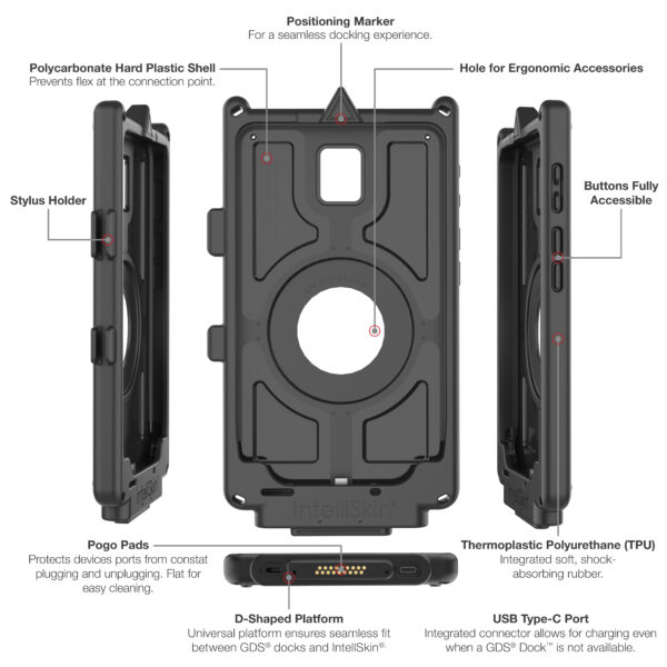 The IntelliSkin Next Gen protective sleeve for the Samsung Galaxy Tab Active5 (RAM-GDS-SKIN-SAM90-NG) is an insert molded design that combines a hard plastic shell with soft, shock-absorbing rubber and an integrated GDS connector that upgrades the device’s USB-C port to flat, ruggedized pogo pads. These pogo pads are easy to clean and prevent damage from constant plugging and unplugging in environments where the combination of debris and daily, repetitive docking is unavoidable. As an added benefit, the pogo pad technology boasts up to 30% faster charging than traditional USB-C connection. Built with every scenario in mind, the IntelliSkin also features an integrated USB Type-C connector that allows for device charging for when there is no GDS Dock available. This sleeve features military-grade drop protection and includes a dedicated slot for the S Pen. The IntelliSkin unlocks the GDS Ecosystem, with a wide variety of GDS Docks, input devices, and ergonomic accessories available to customize your solution. Always Protected. Always Connected.