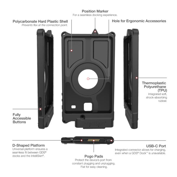 - GDS® connector and docking contacts provide charging and data sync capabilities; universal positioning marker compatible with IntelliSkin® Next Generation docks