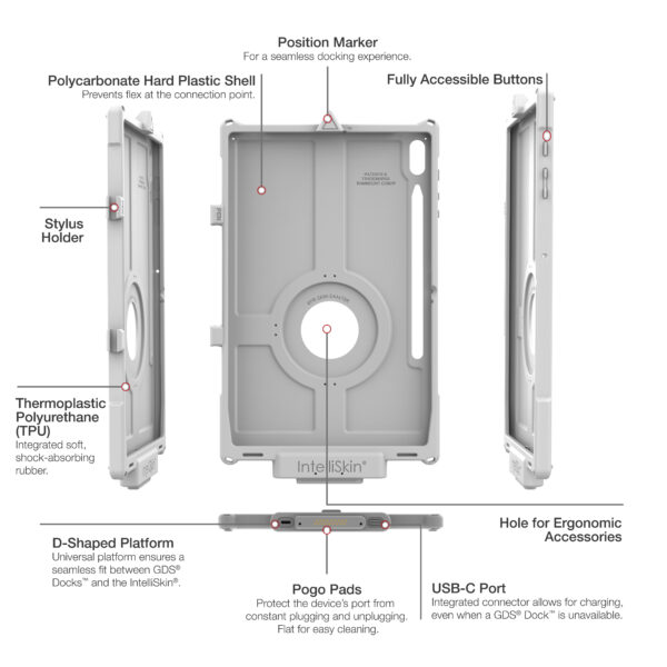 The IntelliSkin Next Gen for Samsung Tab S8+, S7+ & S7 FE 12.4″ – Gray (RAM-GDS-SKIN-SAM78-NG-GRY) is an insert molded skin that combines a hard plastic shell with soft, shock-absorbing rubber. The light gray aesthetic is ideal for sophisticated, bright workplaces in industries such as retail, medical, and more. Ruggedized contacts for repetitive docking in field applications remain on the exterior, but are now flat to collect less dirt and allow for easier cleaning. And an integrated USB Type-C connector at the bottom of the skin allows for device charging even when you dont have a GDS Dock available. Like the original IntelliSkin, these sleeves still provide military-grade drop protection and prevent damage to your devices charging port from constant docking with an integrated GDS connector molded directly into the skin. The IntelliSkin Next Generation for the Samsung Tab S8+, S7+ 12.4″ SM-T970 is compatible with a variety of GDS Docks and accessories, as well as new docking cups for upgrading existing GDS vehicle docks. Always Protected. Always Connected.