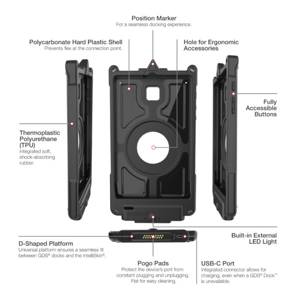 - GDS® connector and docking contacts provide charging and data sync capabilities; universal positioning marker compatible with IntelliSkin® Next Generation docks
