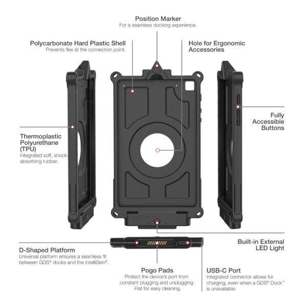 The IntelliSkin Next Generation protective sleeve for the Samsung Galaxy Tab A 8.4 (2020) includes all the great features of the original IntelliSkin while adding several enhancements. An insert molded redesign of the skin combines a hard plastic shell with soft, shock-absorbing rubber. Ruggedized contacts for repetitive docking in field applications remain on the exterior, but are now flat to collect less dirt and allow for easier cleaning. An integrated USB Type-C connector at the bottom of the skin allows for device charging even when you dont have a GDS Dock available. This variation also integrates a powerful LED light in the back of the IntelliSkin with an on/off button on the front. Like the original IntelliSkin, these sleeves still provide military-grade drop protection and prevent damage to your devices charging port from constant docking with an integrated GDS connector molded directly into the skin. The IntelliSkin Next Generation for the Samsung Galaxy Tab A 8.4 (2020) is compatible with a variety of GDS Docks and accessories, as well as new docking cups for upgrading existing GDS vehicle docks. Always Protected. Always Connected.