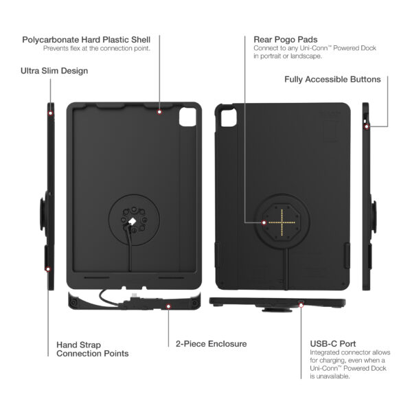 • Two-piece, hard plastic enclosure for Apple iPad Pro 12.9 (3rd-6th Gen) with integrated GDS® Uni-Conn™ adapter with rear pogo pads