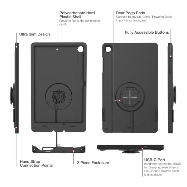 The IntelliSkin Thin-Case for Samsung Tab A11+ (Rear Pogo Pads) (RAM-GDS-SKIN-SAM88-TCB-1) is a low-profile, two-piece device enclosure designed for the GDS Uni-Conn docking platform. The GDS connection style integrates a USB-C connector that routes through the case to the pogo pads integrated into the GDS Uni-Conn adapter. The robust polycarbonate shell protects your device from daily wear and tear while the complete enclosure makes it difficult for unauthorized users to access the tablet, providing additional peace of mind for tablets mounted in high-traffic environments. The flat, ruggedized pogo pad contacts are made for repetitive docking to protect the device’s port and collect less dirt making them easier to clean. An integrated USB Type-C connector at the bottom of the case allows for device charging even when you don’t have a GDS Powered Uni-Conn Dock available. The IntelliSkin Thin-Case for the Samsung A11+ is only compatible with GDS Powered Uni-Conn docks, easily identified by the GDS Powered Uni-Conn Adapter emblem. One Dock to Connect Them All. Always Protected. Always Connected.