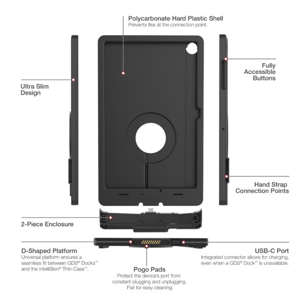 The IntelliSkin Thin-Case for Samsung Tab A11+ (RAM-GDS-SKIN-SAM88-TCD-1) is a low-profile, two-piece device enclosure designed for the GDS Uni-Conn docking platform. The case features the Distinctive D-Shape integrated USB-C connector with external pogo pads. The robust polycarbonate shell protects your device from daily wear and tear while the complete enclosure makes it difficult for unauthorized users to access the tablet, providing additional peace of mind for tablets mounted in high-traffic environments. The flat, ruggedized pogo pad contacts are made for repetitive docking to protect the device’s port and collect less dirt making them easier to clean. An integrated USB Type-C connector at the bottom of the case allows for device charging even when you don’t have a GDS Dock available. Always Protected. Always Connected.