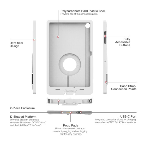 The IntelliSkin Thin-Case for Samsung Tab A9+ – Gray (RAM-GDS-SKIN-SAM88-TCD-GRY) is a low-profile, two-piece device enclosure designed for the GDS Uni-Conn docking platform. The Case features the Distinctive D-Shape integrated USB-C connector with external pogo pads. The robust polycarbonate shell protects your device from daily wear and tear while the complete enclosure makes it difficult for unauthorized users to access the tablet, providing additional peace of mind for tablets mounted in high-traffic environments. The flat, ruggedized pogo pad contacts are made for repetitive docking to protect the device’s port and collect less dirt making them easier to clean. An integrated USB Type-C connector at the bottom of the case allows for device charging even when you dont have a GDS Dock available. The light gray aesthetic is ideal for sophisticated, bright workplaces in industries such as retail, medical, and more. Always Protected. Always Connected.