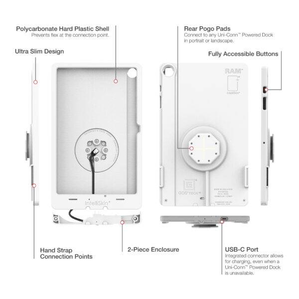 The IntelliSkin Thin-Case for Samsung Tab A9+ (Rear Pogo Pads) – Gray (RAM-GDS-SKIN-SAM88-TCB-GRY) is a low-profile, two-piece device enclosure designed for the GDS Uni-Conn docking platform. The GDS connection style integrates a USB-C connector that routes through the case to the pogo pads integrated into the GDS Uni-Conn adapter. The robust polycarbonate shell protects your device from daily wear and tear while the complete enclosure makes it difficult for unauthorized users to access the tablet, providing additional peace of mind for tablets mounted in high-traffic environments. The flat, ruggedized pogo pad contacts are made for repetitive docking to protect the device’s port and collect less dirt making them easier to clean. An integrated USB Type-C connector at the bottom of the case allows for device charging even when you dont have a GDS Powered Uni-Conn Dock available. The IntelliSkin Thin-Case for the Samsung A9+ is only compatible with GDS Powered Uni-Conn docks, easily identified by the GDS Powered Uni-Conn Adapter emblem. The light gray aesthetic is ideal for sophisticated, bright workplaces in industries such as retail, medical, and more. One Dock to Connect Them All. Always Protected. Always Connected.
