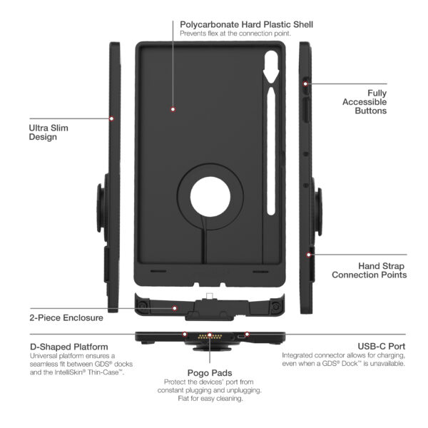 The IntelliSkin Thin-Case for Samsung Tab S10+, S9+ & S9 FE+ (RAM-GDS-SKIN-SAM96-TCD) is a low-profile, two-piece device enclosure designed for the GDS Uni-Conn docking platform. The case features the Distinctive D Shape integrated USB-C connector with external pogo pads. The robust polycarbonate shell protects your device from daily wear and tear while the complete enclosure makes it difficult for unauthorized users to access the tablet, providing additional peace of mind for tablets mounted in high-traffic environments. The flat, ruggedized pogo pad contacts are made for repetitive docking to protect the device’s port and collect less dirt making them easier to clean. An integrated USB Type-C connector at the bottom of the case allows for device charging even when you dont have a GDS Dock available. Always Protected. Always Connected.