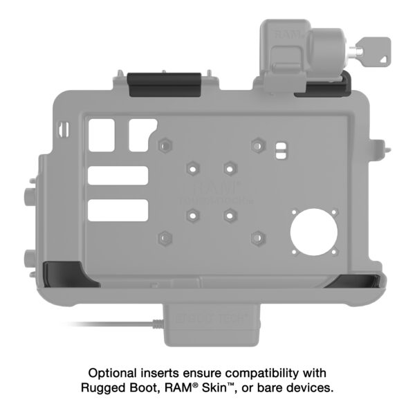 The Locking RAM Thin-Dock for Zebra ET401 & ET4x 10″ (RAM-HOL-ZE47PLU) delivers a low-profile, 2.45″-deep design reinforced with a durable metal plate, ideal for applications where space is limited. This vehicle dock is purpose-built for the Zebra ET401, ET40, and ET45 10″ enterprise tablets, connecting directly to the tablet’s integrated pogo pins to ensure a reliable, long-lasting mounting and charging solution. Engineered for efficiency, the Thin-Dock keeps your tablet powered through pogo pin contacts while docked, with power supplied via the docks USB Type-C connector. The design also maintains access to the tablets side scanning function, making it a strong fit for field service, warehousing, retail, transportation, and other data-capture environments. Because of its compact footprint, this dock does not support add-ons like the Zebra Expansion Back or PowerPack Battery. For mounting flexibility, the dock is compatible with both RAM C and D size 4-hole AMPS pattern bases, ideal for pairing with a double socket arm to complete your vehicle or workstation setup. This dock also features integrated attachment points for the RAM Vent-Temp, a temperature control accessory, and the RAM NFC Extender. Enhance your workflow further using the integrated 2-hole mounting plate, compatible with RAM 2-hole diamond bases, allowing you to mount an additional device such as a phone, handheld scanner, or other accessories.