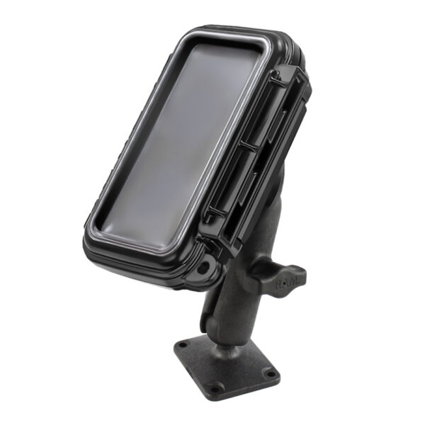 The RAP-B-140-AQ2U consists of a square base with the universal AMPS hole pattern, double socket arm, 2.5″ diameter round base with the universal AMPS hole pattern and sealed enclosed medium size AQUA BOX. The mount is designed with a RAM 1″ diameter patented rubber ball and socket system that has adjustment points at both ends of the double socket arm; this allowing for almost infinite adjustment and perfect viewing angles. The AQUA BOX case provide sealed enclosure and protection for your handheld device. The clear, touch through screen allows you to view your electronics as well as use their function keys while in place. There is even a place for a small lock to serve as a theft deterrent.