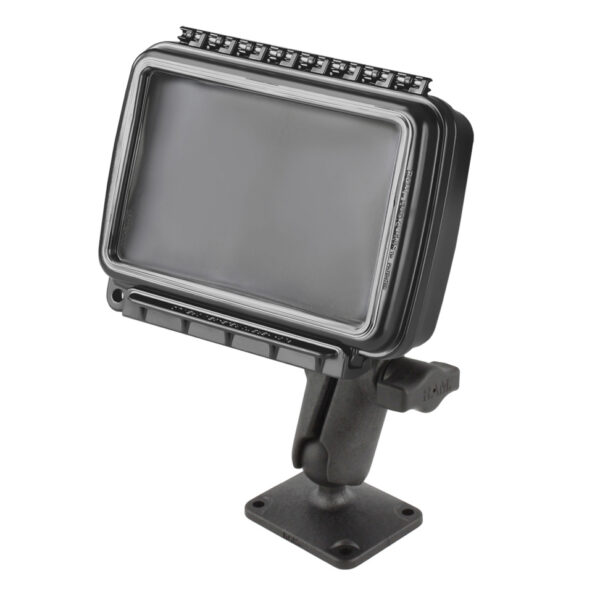 The RAP-B-140-AQ6U consists of a square base with the universal AMPS hole pattern, double socket arm, 2.5″ diameter round base with the universal AMPS hole pattern and sealed enclosed medium/wide size AQUA BOX. The mount is designed with a RAM 1″ diameter patented rubber ball and socket system that has adjustment points at both ends of the double socket arm; this allowing for almost infinite adjustment and perfect viewing angles. The AQUA BOX case provide sealed enclosure and protection for your handheld device. The clear, touch through screen allows you to view your electronics as well as use their function keys while in place. There is even a place for a small lock to serve as a theft deterrent.