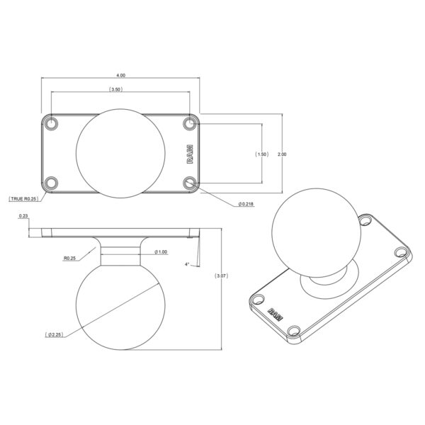 The RAM-D-202U-24 contains a 2.25″ diameter rubber ball connected to a rectangular plate with a 4-hole pattern of 1.5″ x 3.5″ center to center.