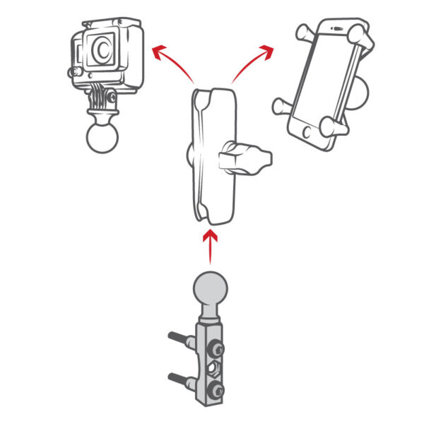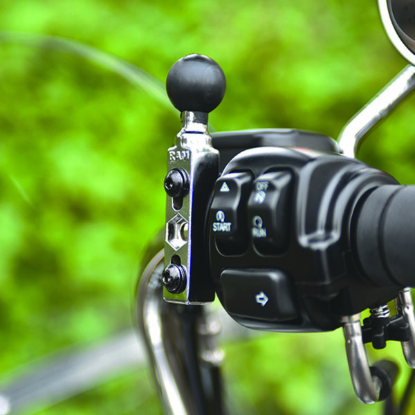 The RAM-B-309-1CHU connects to your handlebar clutch/brake clamp, left or right side, and holds one 1″ diameter mounting ball. The chrome base fits the control clamps on your motorcycle with 40mm x 6mm stainless steel hardware, provided in the kit. To see if the RAM-B-309-1CHU base will mount to your motorcycle, check the hole spacing of the base against your clutch/brake reservoir. The holes centers have a minimum width of 0.94″ and a maximum of 1.58″. This base allows for an additional mount using the RAM Motorcycle 1″ Ball Adapter.