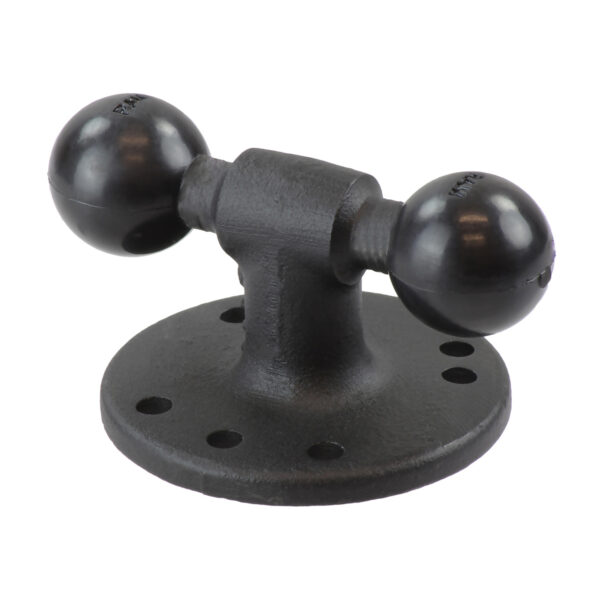 The RAM-B-217U consists of two 1″ diameter rubber balls connected to a post and 2.5″ diameter round base. The round base has pre-drilled holes, including the universal AMPs hole pattern and 3-hole 120 degree pattern. The 1″ balls measure center to center 2.5″ apart.