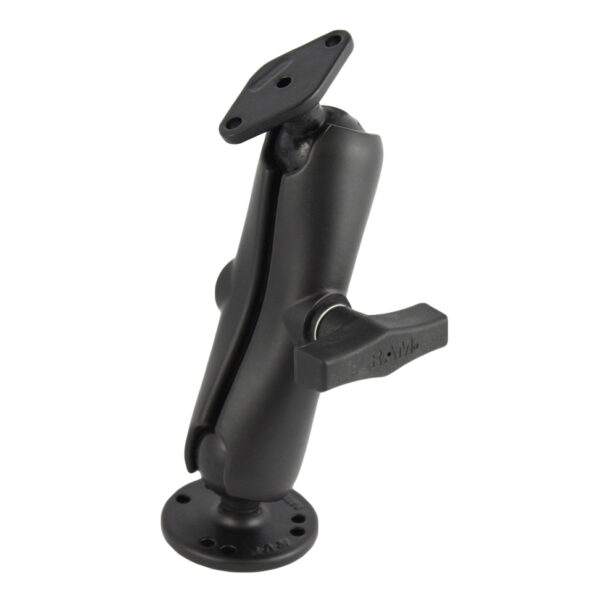 The RAM-138U consists of a 2.5″ diameter round base that contains the universal AMPs hole pattern, double socket arm and diamond base adapter. The mount is designed with a 1.5″ diameter patented rubber ball and socket system that has adjustment points at both ends of the double socket arm; this allowing for almost infinite adjustment and perfect viewing angles. The hole pattern found on the diamond base adapter will connect to most RAM cradles. The included RAMs patented design dampens shock and vibration, helping to extend the life of your device.