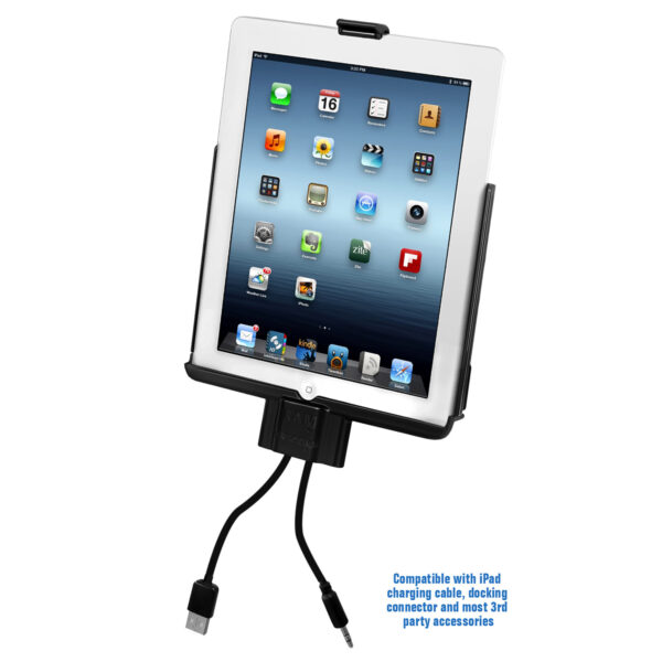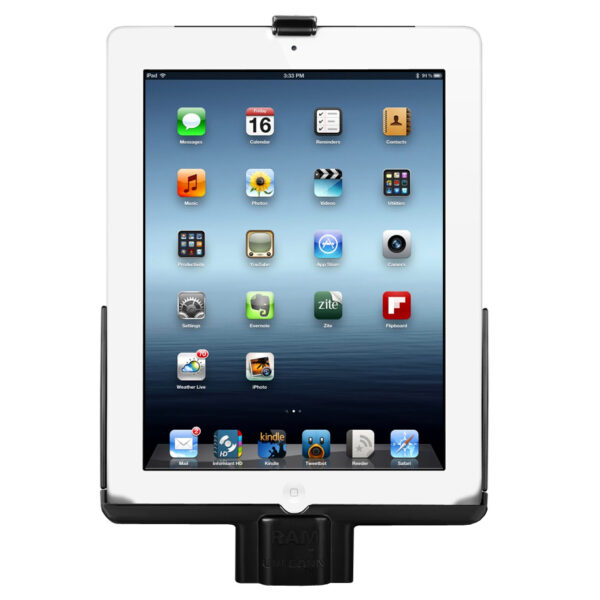The RAM-HOL-AP8DU consists of a high strength composite cradle, patent pending roller design and docking connector for the Apple iPad 1. The docking connector enables the use of the factory iPad cables with docking connector for charging as well as other functions. Also works with most aftermarket cables and or modules with docking connectors. With the vast variety of available cable/docking connector accessories for the iPad you can quickly dock your iPad for charging, line out audio, external GPS antenna and much more. The patent pending roller design allows for smooth placement and removal of the iPad, while keeping it secure while on the go. Multiple AMPs hole patterns found on the back of the cradle make it convenient for attaching various mounts for perfect articulation and viewing angles. Compatible and interchangeable with a wide range of popular RAM Mounting products, this cradle is ready to compliment your iPad and become the most useful accessory in your vehicle. Included is a set of four nuts and bolts to connect the cradle to any RAM components or mounts that contain the universal AMPs hole pattern.