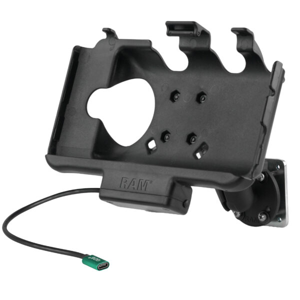 RAM Mounts has partnered with Samsung to develop a powered cradle for the Samsung Galaxy Tab Active5, Tab Active3 & 2. Compatible with the Samsung OEM case as well as the RAM Skin, this cradle has been designed to meet the demands of field workers in a variety of applications including transportation, field sales, logistics, manufacturing, and much more. This ultra-low cost cradle provides power to the device through the pogo pin interface on the tablet and can be easily rotated for both portrait and landscape operation of the device. This complete mounting kit includes a 2.10″ x 2.60″ steel backing plate with #8-32 threaded holes, two 2.5 round ball plates, medium length double socket arm, and a GDS modular hardwire charger an ideal solution for providing power to the Galaxy Tab Active5, 3 & 2.
