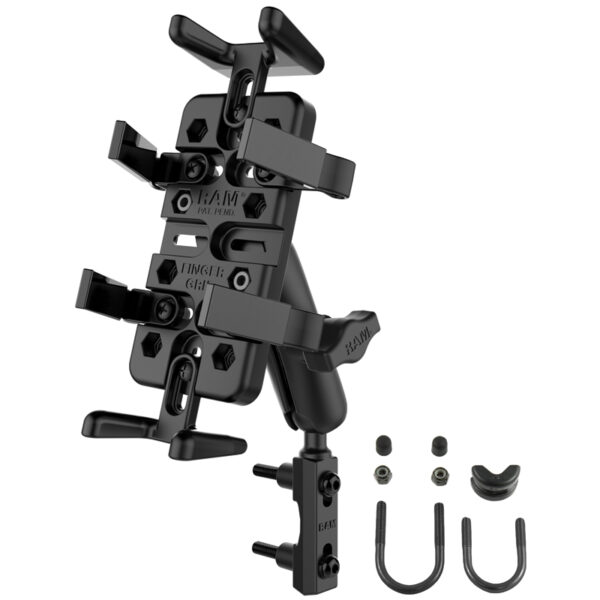 The RAM-B-174-UN4U consists of a hardware for mounting to both brake/clutch reservoirs and rails that are 0.5″ to 1.25″ in diameter, double socket arm, diamond adapter base and high strength universal Finger Grip cradle. The mounting hardware for brake/clutch reservoirs include both standard and metric mounting bolts. The base fits the control clamps on your motorcycle with 40mm x 6mm stainless steel hardware, provided in the kit. To see if the base will mount to your motorcycle, check the hole spacing of the base against your clutch/brake reservoir. The holes centers have a minimum width of 0.94″ and a maximum of 1.58″.