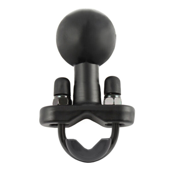 The RAM motorcycle handlebar base contains a 1.5″ rubber ball designed to sit at right angles to the mounting rail. The zinc coated u-bolt accommodates rails in diameter from 0.5″ to 1.25″ in diameter. Included are black cover caps to be placed over the exposed ends of the u-bolt and a composite adapter that can narrow the rail to a minimum width of 0.5″.