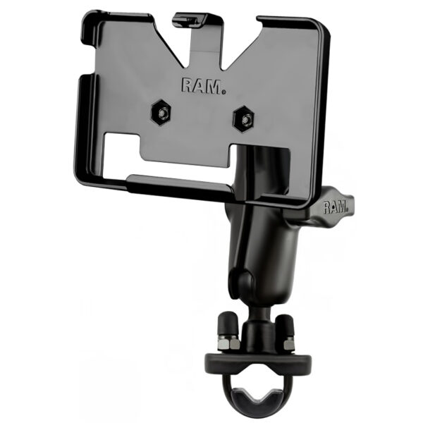 The RAM-B-149Z-GA35U consists of a zinc coated u-bolt base, double socket arm, diamond base adapter and custom form-fitted cradle. Included in this package is hardware that will accommodate rails from 0.50″ to 1.25″ in diameter. The base includes black cover caps to be placed over the exposed ends of the u-bolt. The included composite rail adapter can narrow the rail to a minimum width of 0.5″. The mount is designed with a RAM 1″ diameter patented rubber ball and socket system that has adjustment points at both ends of the double socket arm, allowing for almost infinite adjustment and perfect viewing angles.