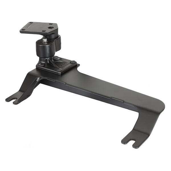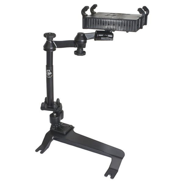 This No-Drill Laptop Stand System installs quickly and easily into the specified vehicles using the existing hardware of the passenger side seat rails. This configuration provides a telescoping feature with upper and lower poles that allow you to set your mount to the desired height with the simple turn of a knob. Dual swing arms provide articulation and 12 inches of reach for passenger and driver access to the mounted device. Patented rubber ball and socket joint provides additional adjustment as well as shock and vibration isolation. The RAM Tough-Tray is spring loaded to accommodate 10″ to 16″ wide laptops (17″ wide screens). The tray features four adjustable retaining arms with rubber grip feature. These arms can be moved both vertically and horizontally. This allows for a custom fit for varying thicknesses of laptops and the freedom of not blocking ports or drives. A screen support and USB light are also available to accessorize the tray. Hole patterns on perimeter of tray facilitate the mounting of additional RAM systems to support GPS or other electronics.