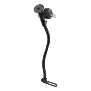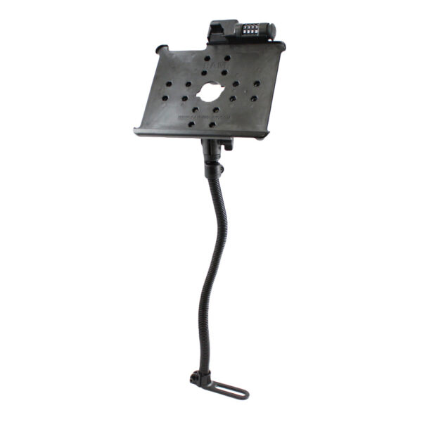 The RAM-B-316-1-AP8L consists of the RAM POD I universal No-Drill vehicle base, 18 rigid aluminum rod, socket system, locking knob and Latch-N-Lock model specific cradle for the Apple iPad 4, iPad 3, iPad 2 and iPad 1. The base of the mount connects to your seat rail without any drilling necessary. The 18″ rigid aluminum rod can be bent to position your device to its optimum viewing location. The mount is designed with a RAM 1″ diameter patented rubber ball and socket system that has adjustment points at both ends of the double socket arm; this allowing for almost infinite adjustment and perfect viewing angles. The cradle includes a dial combination lock for security against theft, along with 4 mounting points with pre-drilled holes on the back. The locking knob attaches to the double socket arm, combining with the dial combination lock, creating the ultimate anti-theft mount for your iPad.