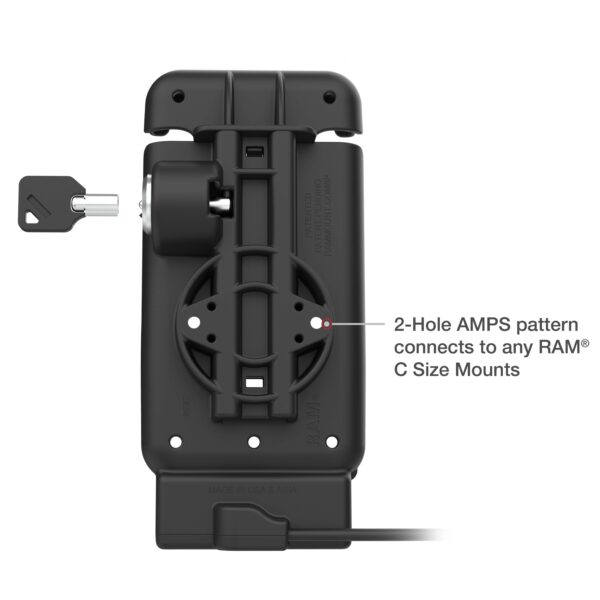 The RAM Locking Vehicle Dock for XCover7 Pro & 6 Pro with Case / RAM Skin (RAM-HOL-V15-SAM84CPLU) is a rugged dock that will meet and exceed the demands of modern workflows, featuring a USB-C connection tested for more than 250,000 cycles. The spring-loaded design of this dock allows for a quick one-handed insertion or removal of your device while the precise design of the dock body minimizes human error and port damage when docking the device onto the USB-C male connector. The back cavity of the dock accommodates ergonomic accessories secured to the back of the device. The key lock provides peace of mind and theft deterrence for high-traffic environments. An integrated cutout on the top allows for the ability to access the device’s top button without removing the device from the dock. Complete the solution by building your mountthis holder is RAM Compatible featuring a 2-hole AMPS pattern for adding a diamond ball adapter.
