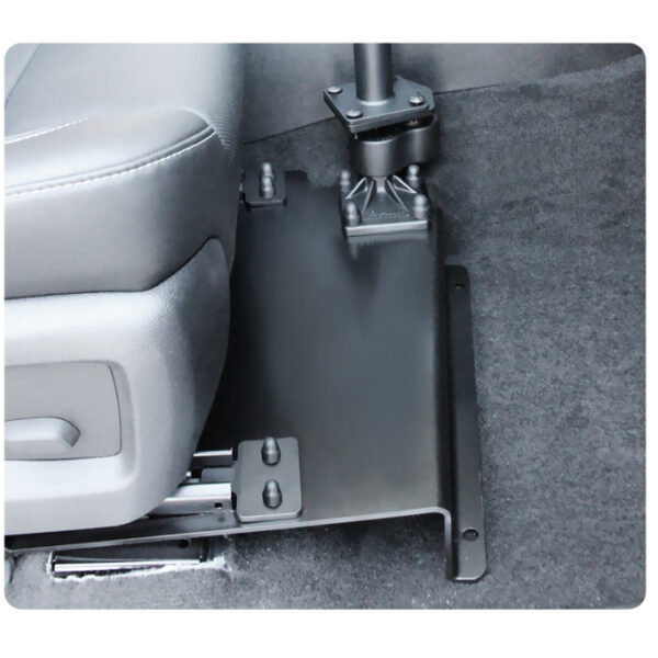 The RAM No-Drill laptop mounting base features a heavy-duty steel mounting base custom designed to fit this vehicle perfectly. Using the passenger side seat rail bolts as attachment points, existing hardware is used to secure the laptop mount base in the vehicle.