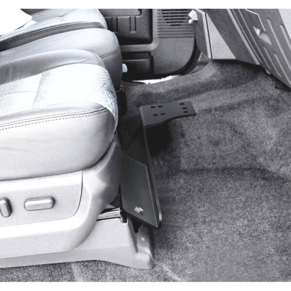 The RAM No-Drill laptop mounting base features a heavy-duty steel mounting base custom designed to fit this vehicle perfectly. Using the front bench or passenger side seat rail bolts as attachment points, existing hardware is used to secure the laptop mount base in the vehicle.