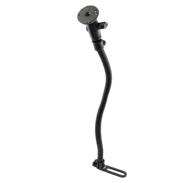 The RAM No-Drill RAM-B-316-1-202U vehicle mount consists of the RAM POD I base, 18 rigid aluminum rod, B Size 1″ ball socket arm, and a round ball plate. The base of the mount connects to your seat rail without any drilling necessary. The 18″ rigid aluminum rod can be bent to position your device an ideal viewing and operating angle. The 2.5″ diameter round base adapter contains the universal AMPS hole pattern. For proper fit, make sure your vehicle has an appropriate bolt to mount the base securely. The RAM-B-316-1-202U is not compatible with 2014 and newer Chevrolet seats that have the seat hook system.