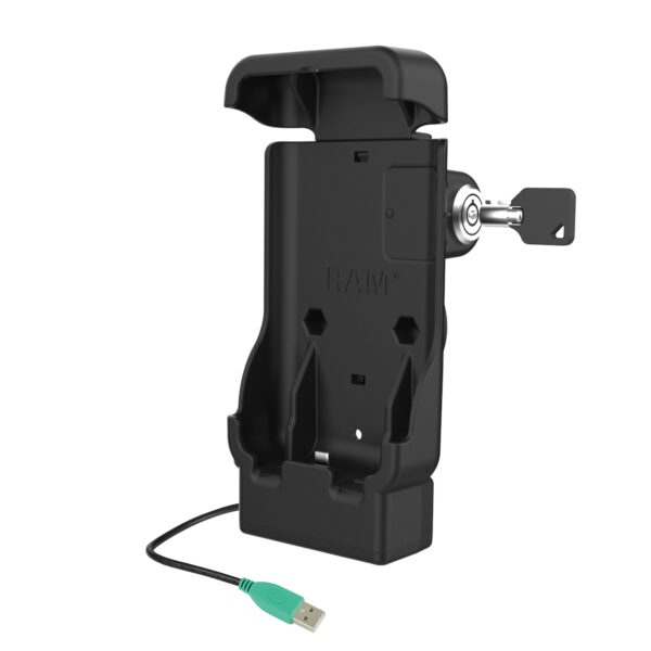 The RAM Powered Vehicle Dock for Zebra EM45 (RAM-HOL-ZE38-A-PU) is rugged dock that will meet and exceed the demands of modern workflows, featuring a USB-C connection tested for more than 250,000 cycles. The spring-loaded design of this dock allows for a quick one-handed insertion or removal of your device while the precise design of the dock body minimizes human error and port damage when docking the device onto the USB-C male connector. The back cavity of the dock accommodates ergonomic accessories secured to the back of the device. An integrated cutout on the top allows for the ability to access buttons, ports, and scanner without removing the device from the dock. The key lock provides peace of mind and theft deterrence for high-traffic environments. Complete the solution by building your mountthis holder is RAM Compatible featuring a 2-hole AMPS pattern for adding a diamond ball adapter.