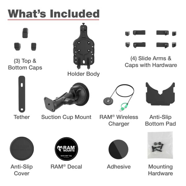 The RAM Quick-Grip Pro Suction Cup Mount with Qi2 15W Wireless Charger (RAM-B-166-PD5-W2MU) is ideal for vehicle windshields and features the next evolution of the RAM Quick-Grip series. This phone holder comes with the RAM Qi2 wireless charger and features an integrated cavity to secure it in place. This phone holder comes with an anti-slip cover ensuring a flush fit when the wireless charging puck is not installed. The RAM Quick-Grip Pro features a spring-loaded design that allows easy one-handed insertion and removal of your phone. The adjustable side arms ensure that your phone will remain secured in the holder without blocking any ports or buttons. This kit includes a 3.3″ diameter RAM Twist-Lock suction cup base that easily installs onto any non-porous surface. RAM recommends installing the provided device tether when this holder is used in a vehicle with an open cockpit. It is important to verify the dimensions of your handheld device with its case, sleeve, or skin when determining the overall size.
