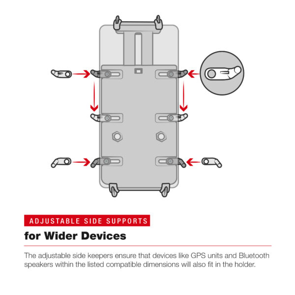 The spring-loaded RAM Quick-Grip with Low-Profile RAM Tough-Claw (RAM-HOL-PD4-400-1U) consists of the small RAM Tough-Claw base and large RAM Quick-Grip phone holder, connected by the RAM Pin-Lock adapter. The adjustable side arms ensure that your phone will remain secured in the holder without blocking any ports or buttons. With the RAM Tough-Claw base connected, easily attach the Quick-Grip on round, square, and odd-shaped rails and bars ranging from .625″ to 1.14″ in outer diameter. This kit is compatible with handheld devices that will fit the dimensions listed below. It is important to verify the dimensions of your handheld device with its case, sleeve, or skin when determining the overall size.