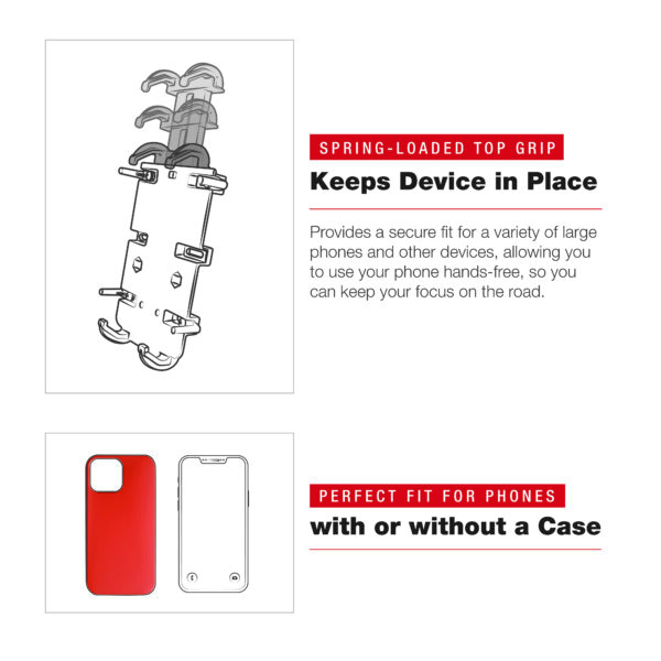 - Spring-loaded holder features adjustable side supports that provide a secure fit for a variety of phones; easily insert and remove your phone with one hand