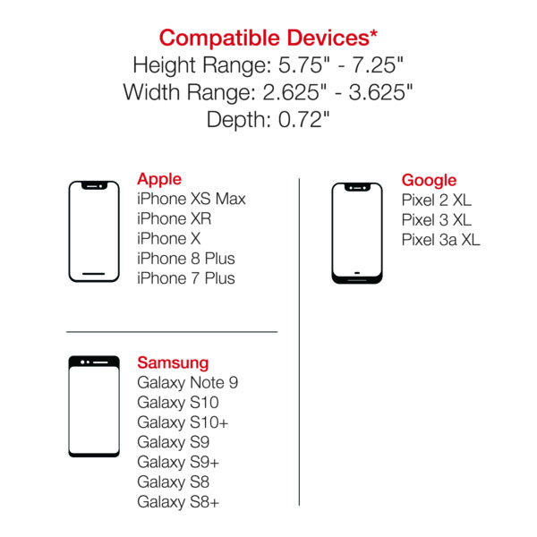 | Holder Dimensions | Height Range: 5.75" – 7.25", Max Depth: .72", Width Range: 2.625" – 3.625" |