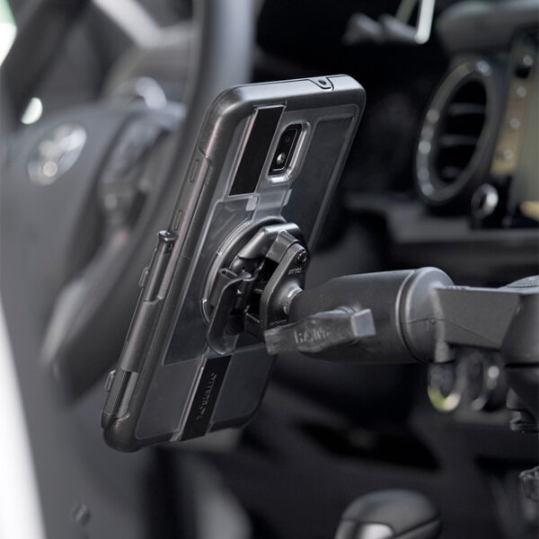 Securely mount your Apple or Samsung Tablet with OtterBox uniVERSE case in your vehicle with the RAM Mounts Quick Release Vehicle Mount Adapter. This kit is compatible with a wide variety of RAM vehicle mounts designed for use in fleet vehicles, commercial aviation, forklifts and more. The adapter connects to the back of your uniVERSE case while the included Quick Release attachment with B size ball allows you to secure your iPad in its uniVERSE case with any RAM B size mounting solution.