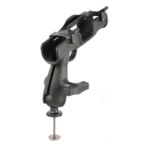 The RAP-341-5 consists of the RAM ROD 2007 Fly Rod Jr. rod holder, single socket and 5 spot mounting base; this compatible with the RAP-114-5PU and RAP-114-5U. Offering the patented RAM rubber ball and socket system feature, you can rotate the rod holder 360 degrees and tilt it forward and back for the optimum angle. Ideally suited for spinning reels and bait casters, the RAM ROD 2007 provides smooth action when inserting or removing your fishing rod, yet holds firm in rough water while trolling.