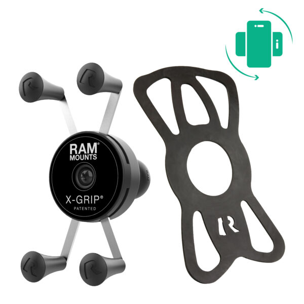 The RAM Rotating X-Grip Phone Holder with Ball – B Size (RAM-HOL-UN7BRU) features the popular spring-loaded ‘X’ design that expands and contracts to provide a perfect fit for your device and pairs it with rotating hardware, allowing users to pivot their device between landscape and portrait orientations. Historically, to change orientations, users have had to loosen the knob of the double socket arm that secures their holder to the three-part mounting solutionthis X-Grip style gets rid of that hassle! Made of powder-coated, marine-grade aluminum, stainless steel components, and high-strength composite, the RAM X-Grip phone holder is compatible with a wide variety of RAM double socket arms and mounting bases. This version of the RAM X-Grip fits phones ranging from 1.87″ to 3.25″ in width and keeps your device completely functional and accessible. No matter what double socket arm and mounting base you pair the RAM X-Grip with, RAM ball-and-socket technology allows for near-infinite adjustability to achieve the ideal viewing angle while also extending the life of your phone by providing shock and vibration damping. For outdoor applications like being used as a motorcycle phone mount the RAM X-Grip includes a device tether recommended for added security and peace of mind.