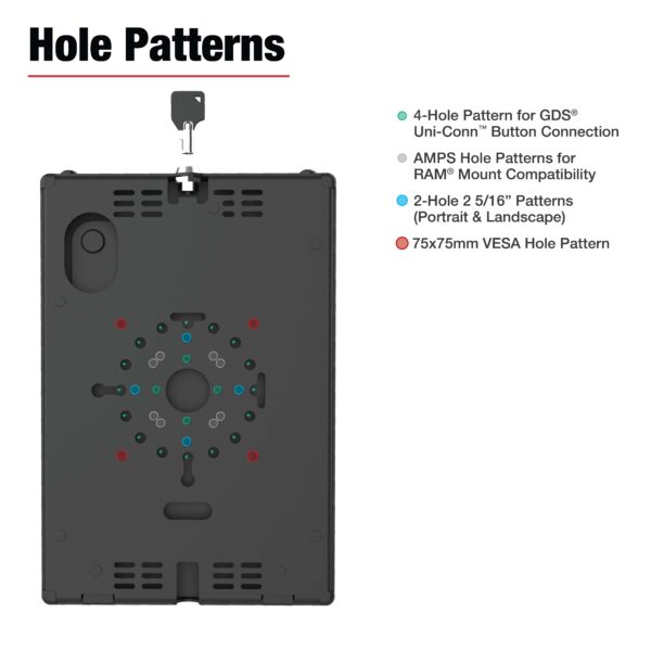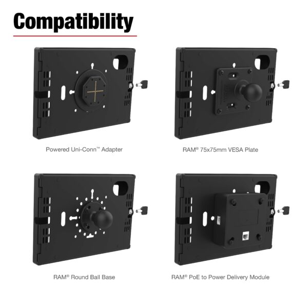 The RAM Safe-Case for Apple iPad mini (A17 Pro) & mini 6 (RAM-TE-AP36) is a rugged, modular enclosure designed for high-security environments. Built from durable two-piece steel, this key-locking tablet case protects against theft, tampering, and tough environmental conditionsideal for demanding field or industrial applications. Custom-fit for the Apple iPad mini, the Safe-Case features precision cutouts for full access to the devices lock button, USB-C port, and rear camera. Ventilation slots and speaker openings maintain device functionality without compromising protection. The enclosure features versatile mounting options with integrated hole patterns for flush mounting, compatibility with RAM double ball mounts, or 75x75mm VESA stands. For added docking functionality, the Safe-Case supports the installation of a GDS Uni-Conn buttonenabling rear pogo pin charging when paired with any compatible GDS dock (look for the octagon icon on product listings).