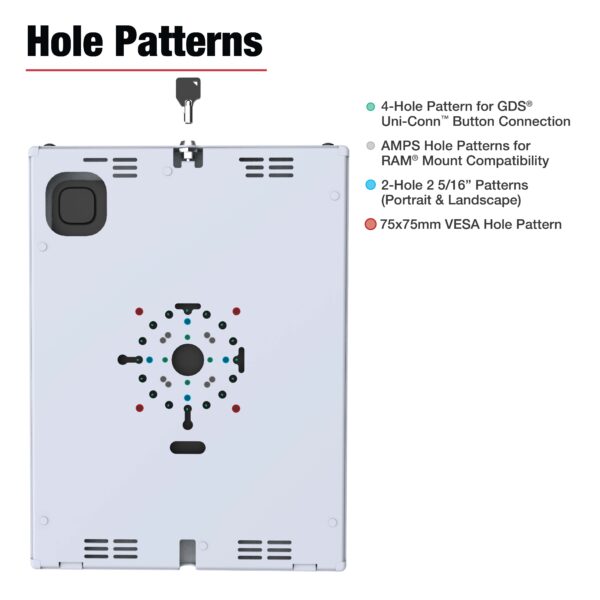 The RAM Safe-Case for iPad Pro 13 (M4 & M5), Air 13 (M2 & M3), & Pro 12.9 Gray (RAM-TE-AP47-GRY) is a rugged, modular enclosure designed for high-security environments. Built from durable two-piece steel, this key-locking tablet case protects against theft, tampering, and tough environmental conditionsideal for demanding field or industrial applications. Custom-fit for the 13″ iPad, the Safe-Case features precision cutouts for full access to the devices lock button, USB-C port, and rear camera. Ventilation slots and speaker openings maintain device functionality without compromising protection. The smooth gray finish not only blends well into professional and industrial settings but also adds a clean, modern aesthetic. The enclosure features versatile mounting options with integrated hole patterns for flush mounting, compatibility with RAM double ball mounts, or 75x75mm VESA stands. For added docking functionality, the Safe-Case supports the installation of a GDS Uni-Conn buttonenabling rear pogo pin charging when paired with any compatible GDS dock (look for the octagon icon on product listings).