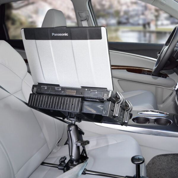 Compact, portable, amazingly strong and no tools required are words that best describe the new RAM Seat-Mate. Able to transform most any passenger seat into a workstation, unfold the legs and buckle it in. Truly innovative in design, this product is able to actively hold onto the seat and stabilize itself. For anyone who needs a temporary mobile workstation, this mounting solution is absolutely perfect. Designed to easily pack into a travel bag, suit case, or even under the seat of a vehicle, RAM makes it possible to create a comfortable workspace in minutes where ever your job takes you. The RAM Seat-Mate is perfect for laptops, tablets, and UMPCs. The integrated rubber ball and socket system allows the user to achieve ergonomic viewing and typing angles. If you’re a mobile professional, this product was designed for you.